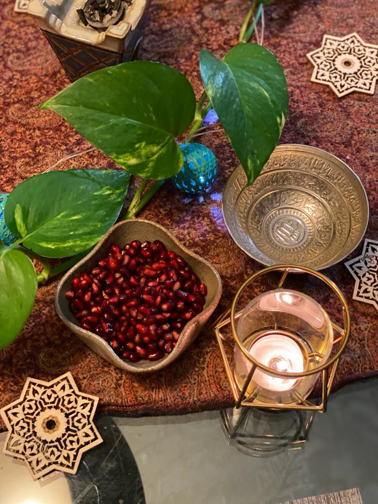 Because this communal gathering is not possible right now, we gathered as a house to celebrate iftaar and learn more about this sacred time. We ate prophetic foods (foods eaten and recommended by the Prophet Muhammad, peace and blessings be upon him) – dates, grapes, watermelon, and pomegranate- and drank holy water from the Well of Zamzam. Ala’ decorated the table with lights and symbolic ornamentation to create an intentional and festival atmosphere.